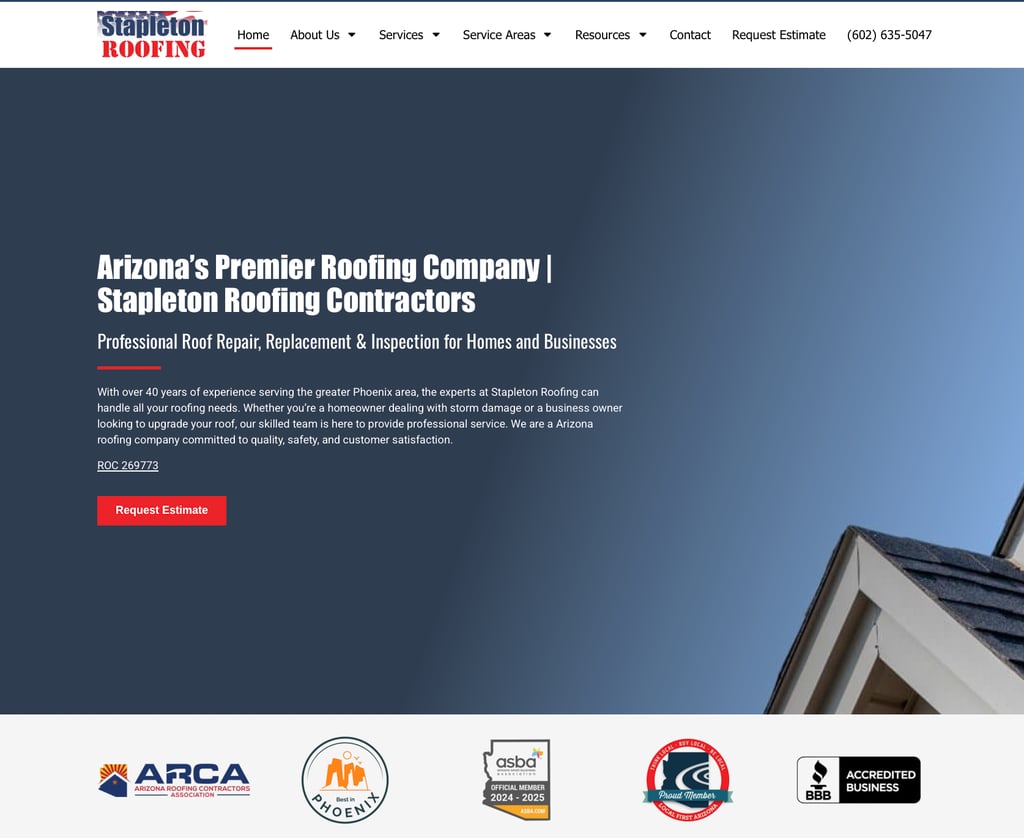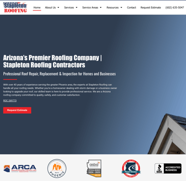 In this review, we analyze Stapleton Roofing (https://www.stapletonroofing.com/), a Phoenix-based roofing contractor serving residential and commercial customers throughout the greater Phoenix area. Roofing is a high-trust, high-cost service, and homeowners often visit contractor websites while stressed, uncertain, or dealing with time-sensitive damage. Because of this, Stapleton Roofing’s digital marketing plays a major role in reassuring visitors and converting them into qualified leads.