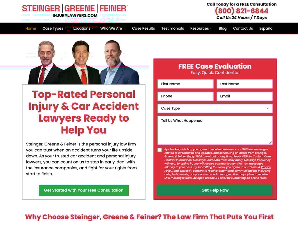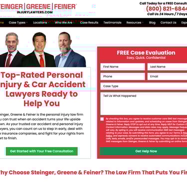 In this review, we analyze Steinger, Greene & Feiner (https://www.injurylawyers.com/), a personal injury law firm serving clients across Florida. As a legal service provider, its marketing must establish authority quickly and build trust with prospective clients.