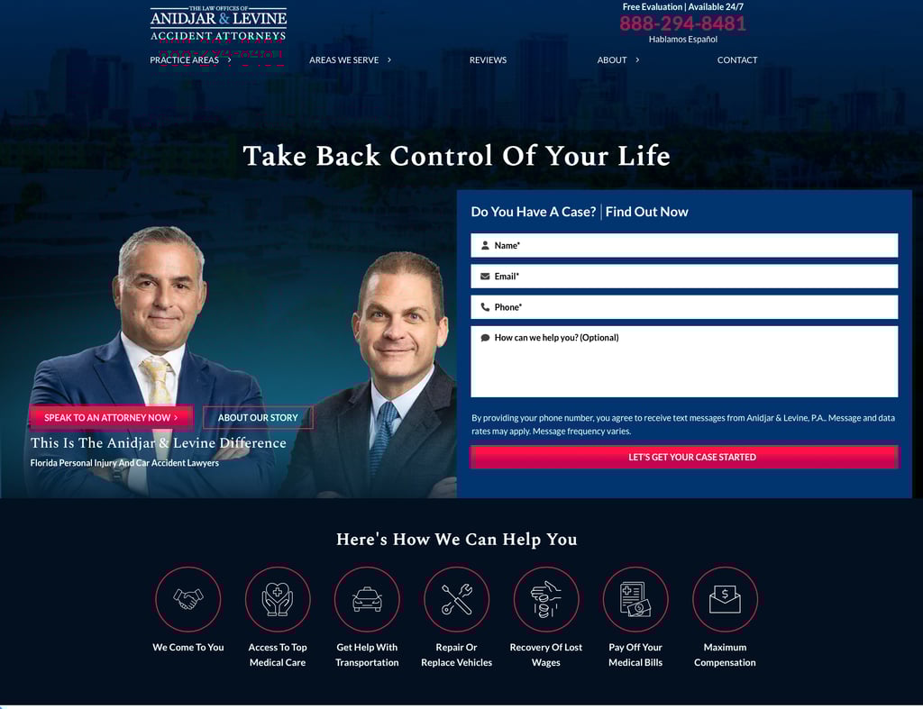 In this review, we analyze The Law Offices of Anidjar & Levine (https://www.anidjarlevine.com/), a personal injury law firm serving clients across Florida. As a firm operating in a competitive legal category, its marketing must quickly establish trust, communicate authority, and encourage prospective clients to take action.